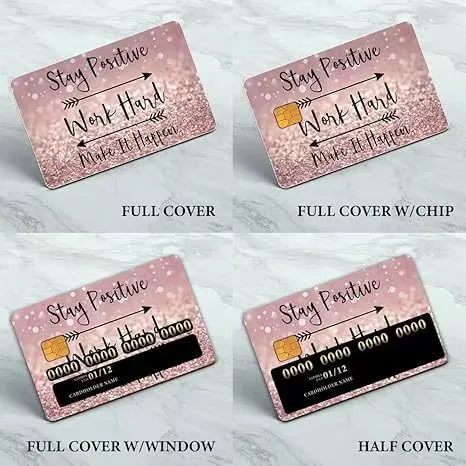 Стикери за кредитни картипредлагат се в различни стилове, включително пълно покритие, половин покритие, покритие с прозорец за номера на картата или чипа и покритие с предварително изрязана зона за микрочипа. Размерът обикновено е проектиран да пасва на кредитни карти със стандартен размер, приблизително 5,3*8,5 см.