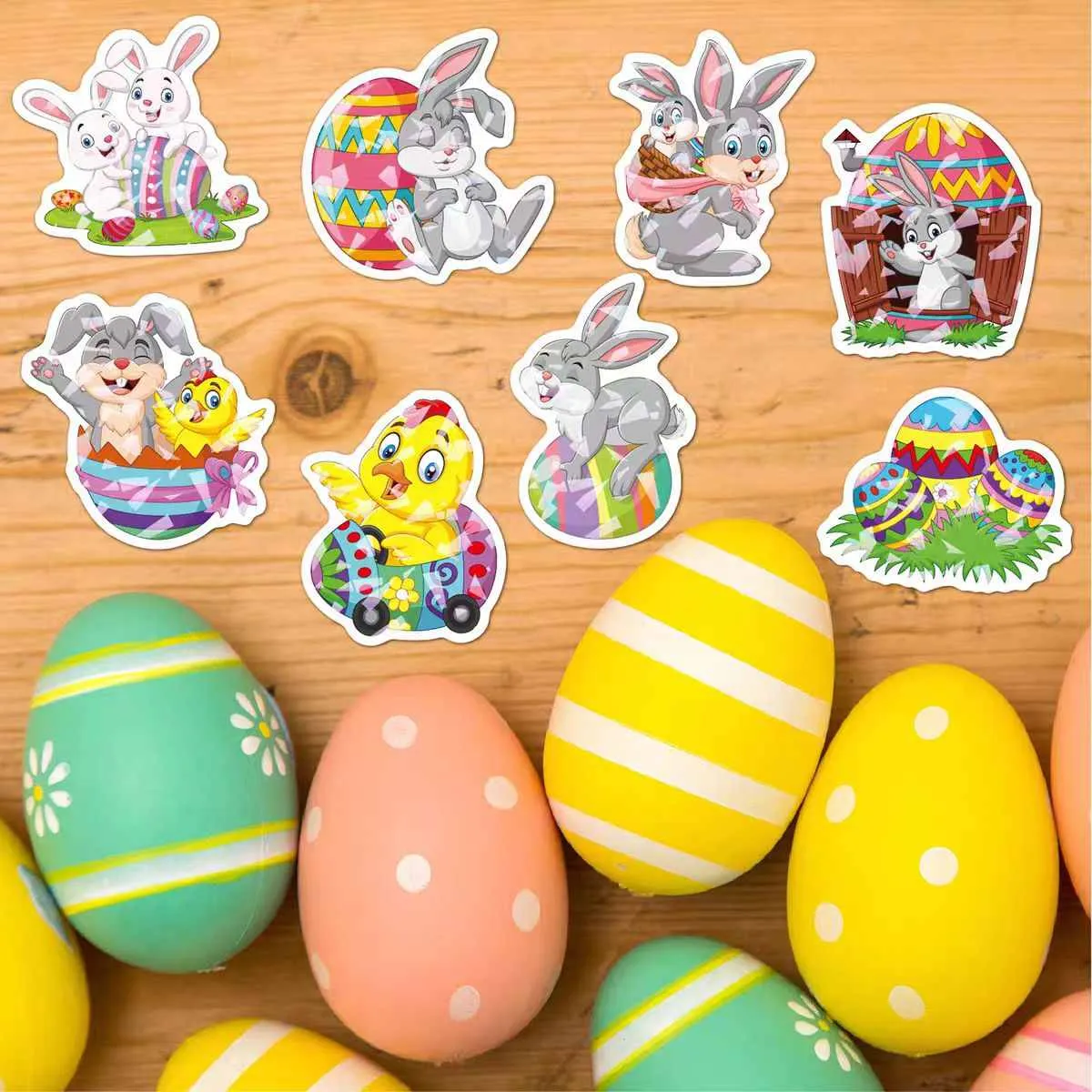 Подходящи за различни великденски цели: малки стикери за яйца или шоколадови черупки, средни за подаръчни кутии и кошници и големи за витрини. Отстранява се лесно без остатъци от повърхности като стъкло, пластмаса или дърво.