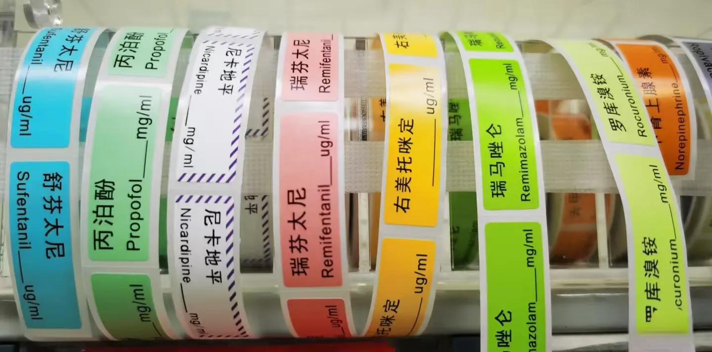 Самозалепващите етикети се прилагат главно върху фармацевтични опаковкиетикети за медицински лекарства, етикети за пломби и етикети за спринцовки. Сред всички самозалепващи сеетикети на лекарства, използването на самозалепващи етикети за медицински лекарства представлява голяма част, следвано от самозалепващи се етикети за запечатване. Сега част от спринцовката започна да използва прозрачни BOPP самозалепващи се етикети за идентифициране на калибрирането. Фармацевтичните продукти в лепилни етикети на бутилки обикновено са хартия с огледално покритие, хартия с покритие и матова хартия, три вида повърхностен материал, също имат част от несъхнещия етикет, използващ хартиен материал от алуминиево фолио. В зависимост от диаметъра на корпуса на бутилката, който трябва да се етикетира, трябва да се използват самозалепващи етикети с различни грамажи и различни лицеви материали.