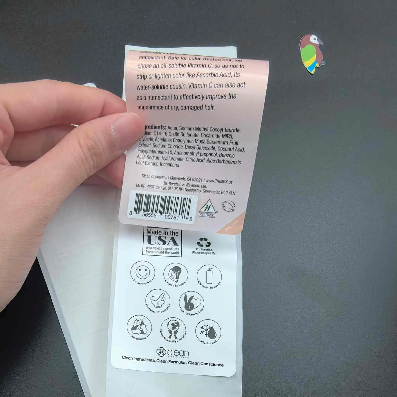О: Това е етикет с 2+ слоя за козметика. Отлепете външния слой, за да разкриете допълнителна информация върху вътрешния слой, без да разширявате размера на етикета.