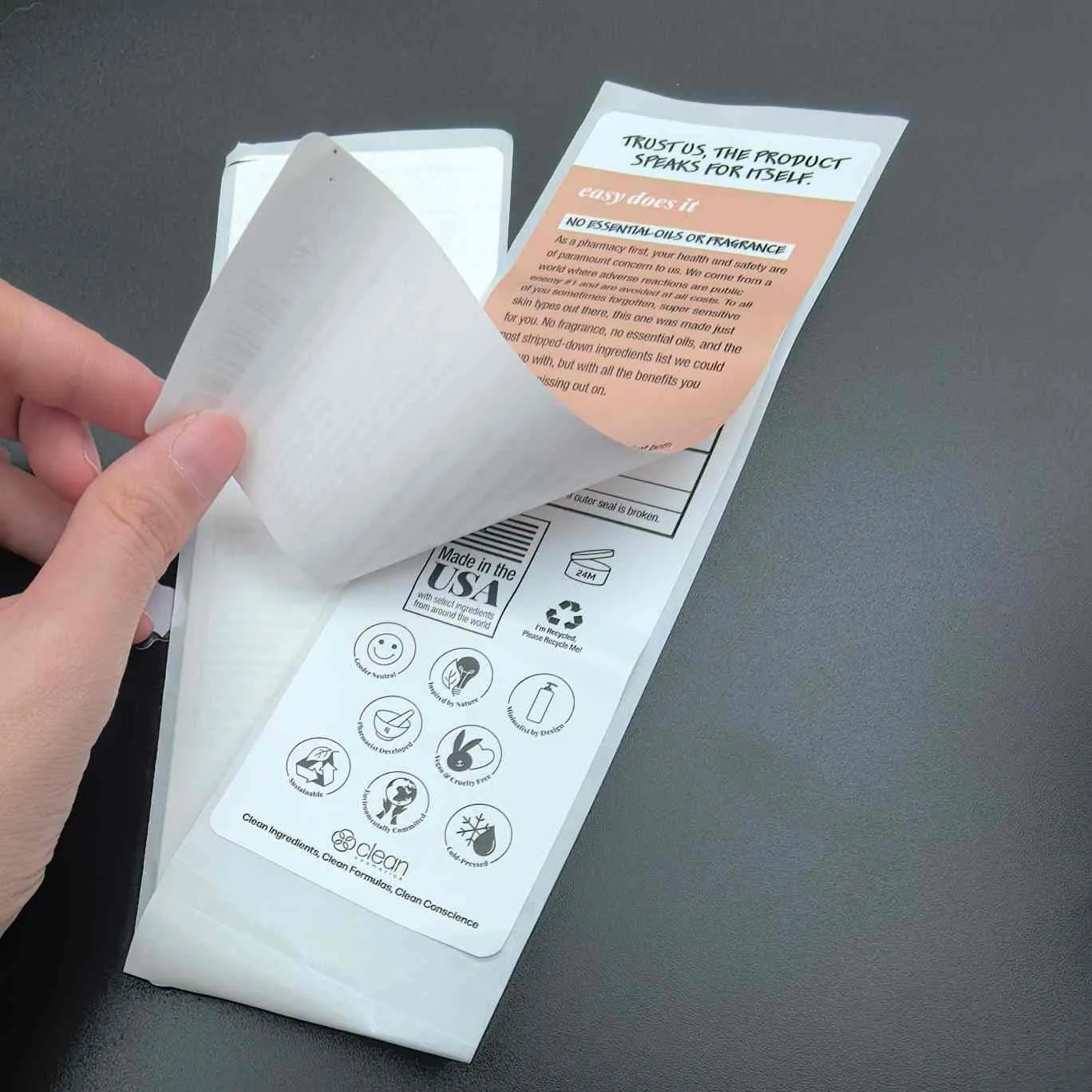 Обелете и прочетете етикетите:Най-основният тип. Нарича се още многослоен за козметични етикети. Горният слой се отлепва лесно, а вътрешният слой съдържа разширена информация. Често се използва за маски за лице, серуми и други продукти в малки опаковки.