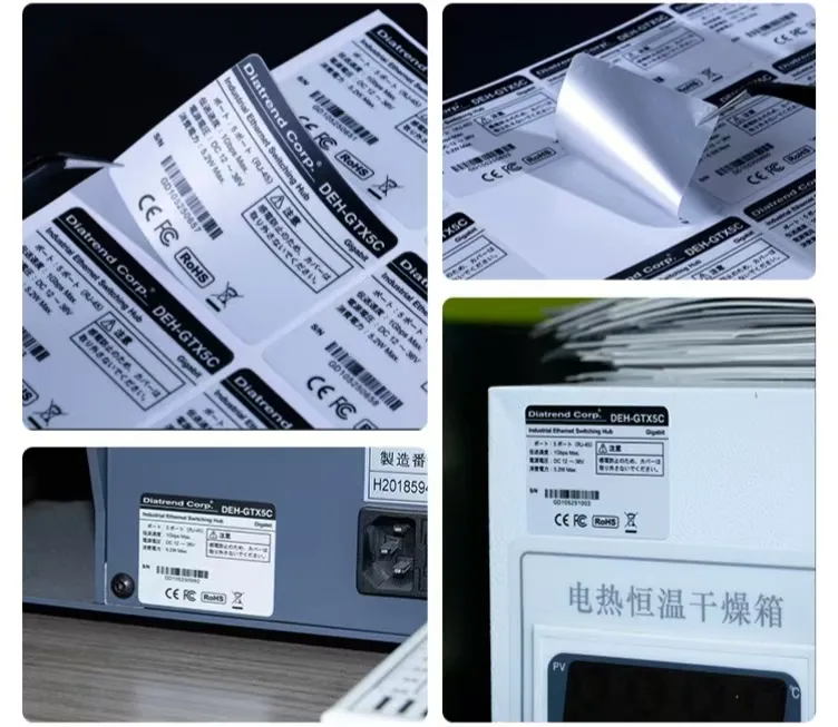PET бяло/матово сребристо: Устойчив на топлина до 150 ℃, подходящ за табелки на домакински уреди и захранващи адаптери.