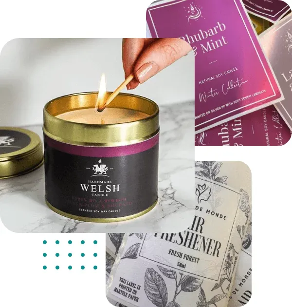Профилиран: Включва рязане на етикета в потребителски форми вместо стандартни правоъгълници. Профилираните етикети се открояват върху бурканите за свещи и се подравняват с уникални идентичности на марката.