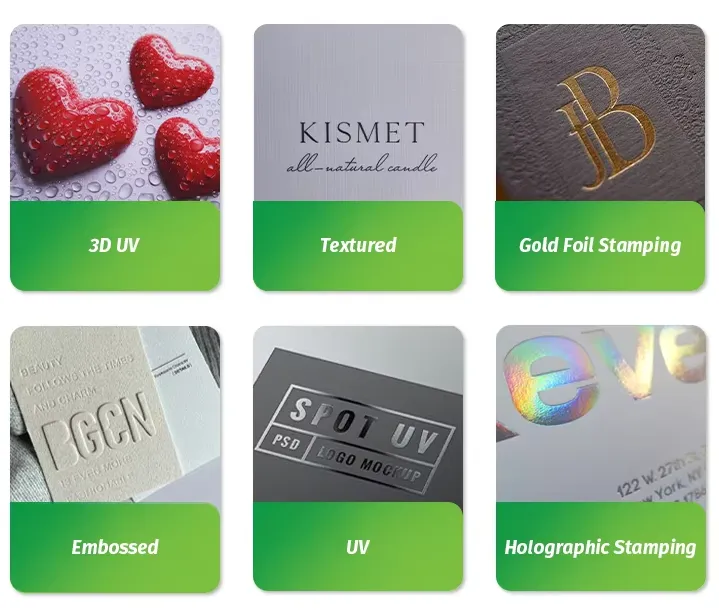 Щамповане: Създава релефни, триизмерни шарки или текст върху етикетите на ароматизираните свещи. Добавя текстура и тактилен елемент, което прави етикетите на ароматизираните свещи по-привлекателни на допир. Щамповането работи добре с лога или декоративни мотиви, подобрявайки първокласното усещане.